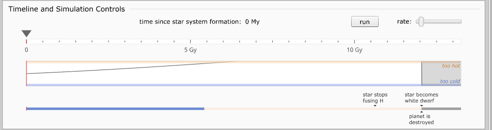 Abaixo da imagem de sua estrela e seu planeta, você pode clicar em “run” para a simulação ser iniciada. Caso queira observar com mais cuidado as partes rápidas, passe entre os momentos com o auxílio da seta do seu teclado. Em “rate” você consegue alterar a velocidade da sua simulação.